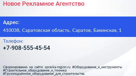 Новое Рекламное Агентство по адресу 410038, Саратовская область, Саратов, Бакинская, 1 в дальнейшем Организация, размещена в следующих категориях: