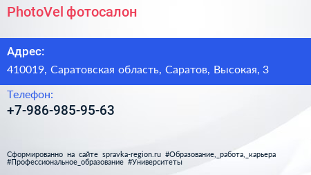 PhotoVel, фотосалон по адресу 410019, Саратовская область, Саратов, Высокая, 3 в дальнейшем Организация, размещена в следующих категориях: