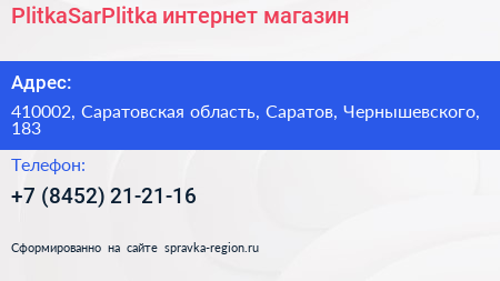 PlitkaSarPlitka, интернет-магазин по адресу 410002, Саратовская область, Саратов, Чернышевского, 183 в дальнейшем Организация, размещена в следующих категориях: