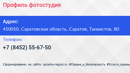 Профиль, фотостудия по адресу 410010, Саратовская область, Саратов, Танкистов, 80 в дальнейшем Организация, размещена в следующих категориях: