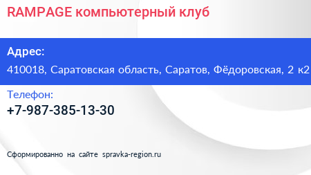 RAMPAGE, компьютерный клуб по адресу 410018, Саратовская область, Саратов, Фёдоровская, 2 к2 в дальнейшем Организация, размещена в следующих категориях:
