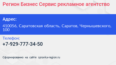 Регион Бизнес Сервис, рекламное агентство по адресу 410056, Саратовская область, Саратов, Чернышевского, 100 в дальнейшем Организация, размещена в следующих категориях: