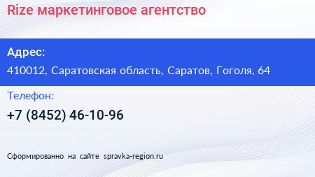 Rize, маркетинговое агентство по адресу 410012, Саратовская область, Саратов, Гоголя, 64 в дальнейшем Организация, размещена в следующих категориях: