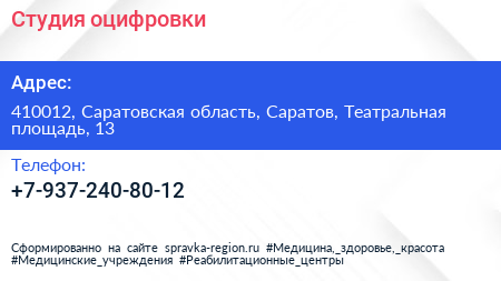 Студия оцифровки по адресу 410012, Саратовская область, Саратов, Театральная площадь, 13 в дальнейшем Организация, размещена в следующих категориях: