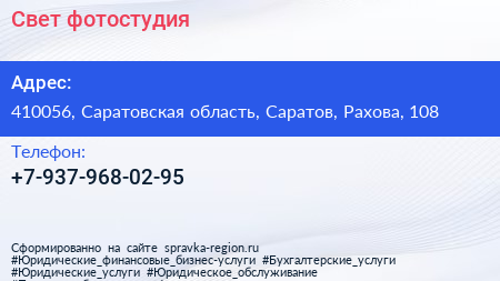 Свет, фотостудия по адресу 410056, Саратовская область, Саратов, Рахова, 108 в дальнейшем Организация, размещена в следующих категориях: