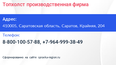 Топхолст, производственная фирма по адресу 410005, Саратовская область, Саратов, Крайняя, 204 в дальнейшем Организация, размещена в следующих категориях: