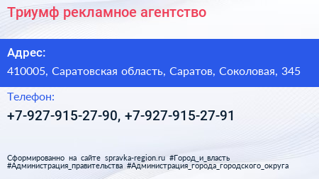 Триумф, рекламное агентство по адресу 410005, Саратовская область, Саратов, Соколовая, 345 в дальнейшем Организация, размещена в следующих категориях:
