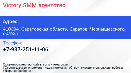 Victory, SMM-агентство по адресу 410004, Саратовская область, Саратов, Чернышевского, 60/62а в дальнейшем Организация, размещена в следующих категориях: