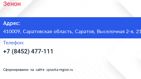 Зенон по адресу 410009, Саратовская область, Саратов, Выселочная 2-я, 21 в дальнейшем Организация, размещена в следующих категориях: