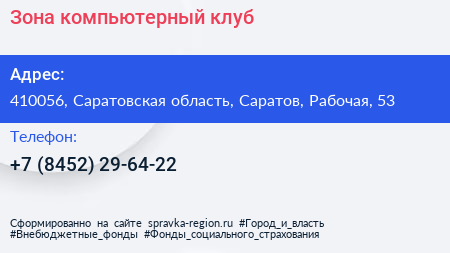 Зона, компьютерный клуб по адресу 410056, Саратовская область, Саратов, Рабочая, 53 в дальнейшем Организация, размещена в следующих категориях: