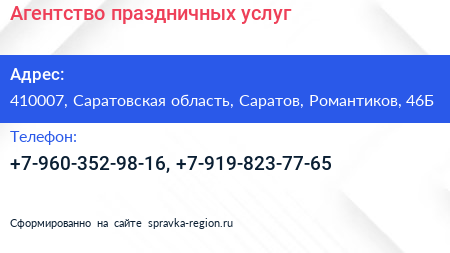Агентство праздничных услуг по адресу 410007, Саратовская область, Саратов, Романтиков, 46Б в дальнейшем Организация, размещена в следующих категориях: