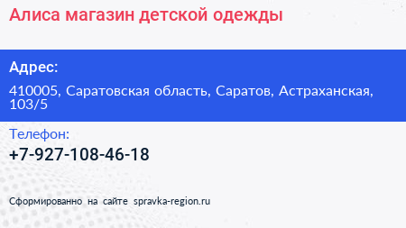 Алиса, магазин детской одежды по адресу 410005, Саратовская область, Саратов, Астраханская, 103/5 в дальнейшем Организация, размещена в следующих категориях: