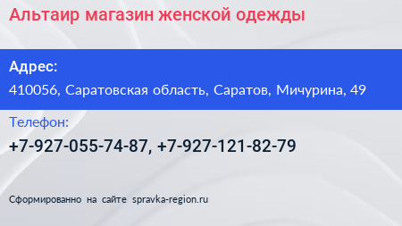 Альтаир, магазин женской одежды по адресу 410056, Саратовская область, Саратов, Мичурина, 49 в дальнейшем Организация, размещена в следующих категориях: