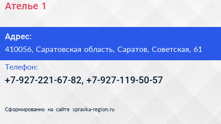 Ателье №1 по адресу 410056, Саратовская область, Саратов, Советская, 61 в дальнейшем Организация, размещена в следующих категориях: