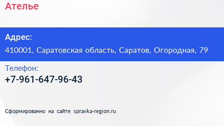 Ателье по адресу 410001, Саратовская область, Саратов, Огородная, 79 в дальнейшем Организация, размещена в следующих категориях: