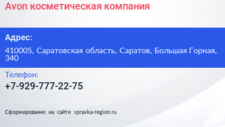 Avon, косметическая компания по адресу 410005, Саратовская область, Саратов, Большая Горная, 340 в дальнейшем Организация, размещена в следующих категориях: