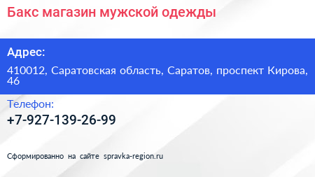 Бакс, магазин мужской одежды по адресу 410012, Саратовская область, Саратов, проспект Кирова, 46 в дальнейшем Организация, размещена в следующих категориях: