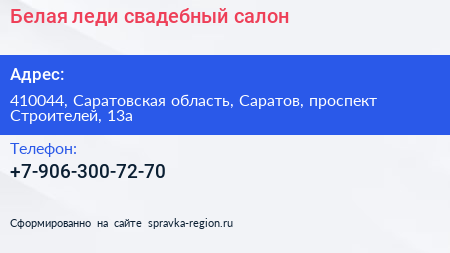 Белая леди, свадебный салон по адресу 410044, Саратовская область, Саратов, проспект Строителей, 13а в дальнейшем Организация, размещена в следующих категориях: