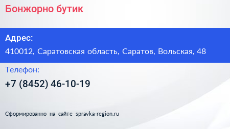 Бонжорно, бутик по адресу 410012, Саратовская область, Саратов, Вольская, 48 в дальнейшем Организация, размещена в следующих категориях: