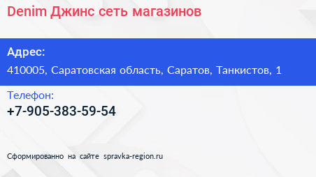 Denim Джинс, сеть магазинов по адресу 410005, Саратовская область, Саратов, Танкистов, 1 в дальнейшем Организация, размещена в следующих категориях: