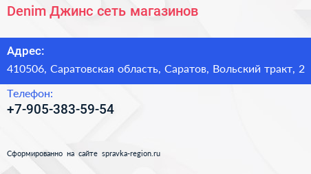 Denim Джинс, сеть магазинов по адресу 410506, Саратовская область, Саратов, Вольский тракт, 2 в дальнейшем Организация, размещена в следующих категориях: