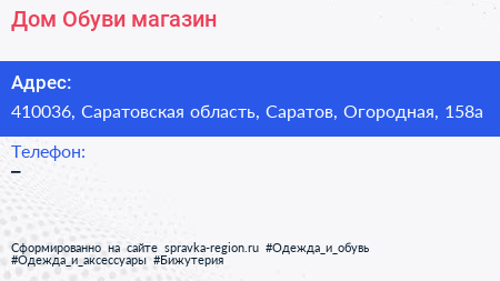 Дом Обуви, магазин по адресу 410036, Саратовская область, Саратов, Огородная, 158а в дальнейшем Организация, размещена в следующих категориях: