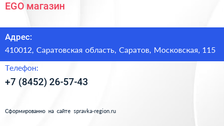 EGO, магазин по адресу 410012, Саратовская область, Саратов, Московская, 115 в дальнейшем Организация, размещена в следующих категориях: