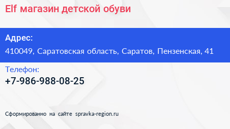 Elf, магазин детской обуви по адресу 410049, Саратовская область, Саратов, Пензенская, 41 в дальнейшем Организация, размещена в следующих категориях: