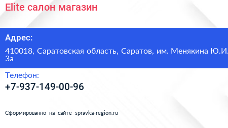 Elite, салон-магазин по адресу 410018, Саратовская область, Саратов, им. Менякина Ю.И., 3а в дальнейшем Организация, размещена в следующих категориях: