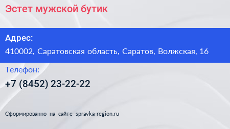 Эстет, мужской бутик по адресу 410002, Саратовская область, Саратов, Волжская, 16 в дальнейшем Организация, размещена в следующих категориях: