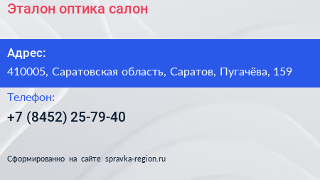 Эталон оптика, салон по адресу 410005, Саратовская область, Саратов, Пугачёва, 159 в дальнейшем Организация, размещена в следующих категориях: