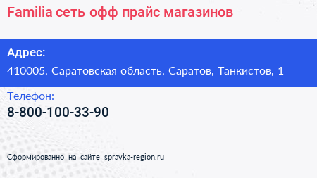 Familia, сеть офф-прайс магазинов по адресу 410005, Саратовская область, Саратов, Танкистов, 1 в дальнейшем Организация, размещена в следующих категориях: