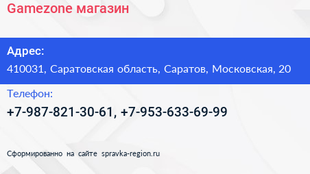 Gamezone, магазин по адресу 410031, Саратовская область, Саратов, Московская, 20 в дальнейшем Организация, размещена в следующих категориях: