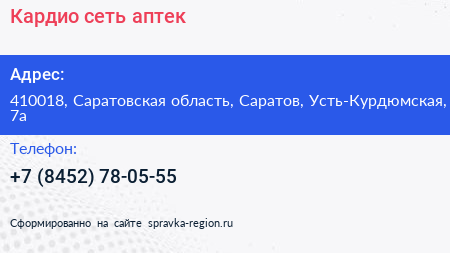 Кардио, сеть аптек по адресу 410018, Саратовская область, Саратов, Усть-Курдюмская, 7а в дальнейшем Организация, размещена в следующих категориях: