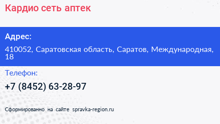 Кардио, сеть аптек по адресу 410052, Саратовская область, Саратов, Международная, 18 в дальнейшем Организация, размещена в следующих категориях: