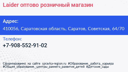 Laider, оптово-розничный магазин по адресу 410056, Саратовская область, Саратов, Советская, 64/70 в дальнейшем Организация, размещена в следующих категориях: