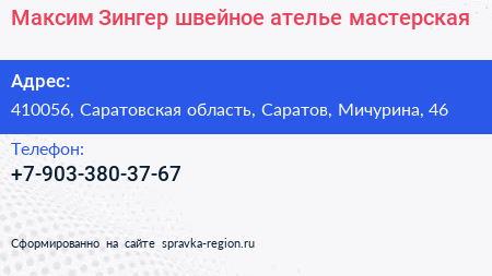 Максим Зингер, швейное ателье-мастерская по адресу 410056, Саратовская область, Саратов, Мичурина, 46 в дальнейшем Организация, размещена в следующих категориях: