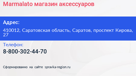 Marmalato, магазин аксессуаров по адресу 410012, Саратовская область, Саратов, проспект Кирова, 27 в дальнейшем Организация, размещена в следующих категориях: