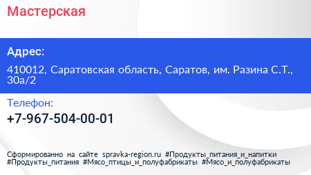 Мастерская по адресу 410012, Саратовская область, Саратов, им. Разина С.Т., 30а/2 в дальнейшем Организация, размещена в следующих категориях: