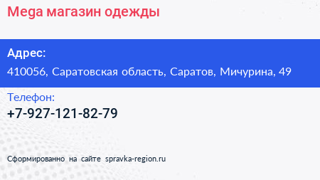 Mega, магазин одежды по адресу 410056, Саратовская область, Саратов, Мичурина, 49 в дальнейшем Организация, размещена в следующих категориях: