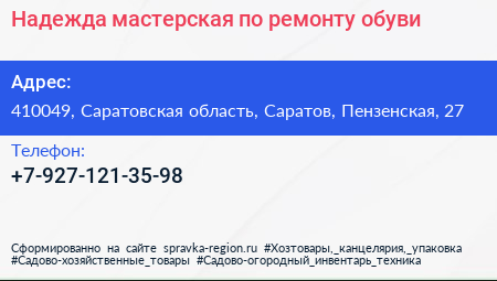 Надежда, мастерская по ремонту обуви по адресу 410049, Саратовская область, Саратов, Пензенская, 27 в дальнейшем Организация, размещена в следующих категориях: