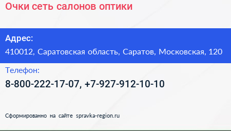 Очки, сеть салонов оптики по адресу 410012, Саратовская область, Саратов, Московская, 120 в дальнейшем Организация, размещена в следующих категориях: