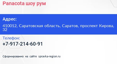Panacota, шоу-рум по адресу 410012, Саратовская область, Саратов, проспект Кирова, 32 в дальнейшем Организация, размещена в следующих категориях: