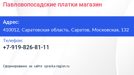 Павловопосадские платки, магазин по адресу 410012, Саратовская область, Саратов, Московская, 132 в дальнейшем Организация, размещена в следующих категориях: