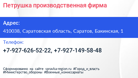 Петрушка, производственная фирма по адресу 410038, Саратовская область, Саратов, Бакинская, 1 в дальнейшем Организация, размещена в следующих категориях: