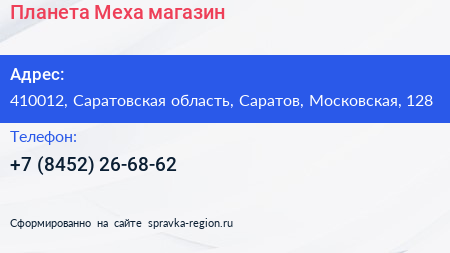 Планета Меха, магазин по адресу 410012, Саратовская область, Саратов, Московская, 128 в дальнейшем Организация, размещена в следующих категориях:
