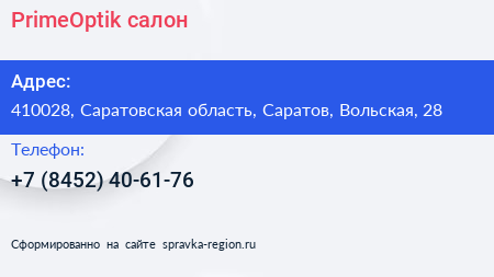 PrimeOptik, салон по адресу 410028, Саратовская область, Саратов, Вольская, 28 в дальнейшем Организация, размещена в следующих категориях: