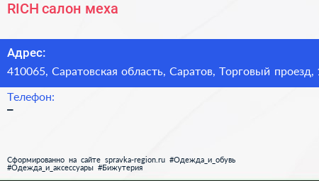 RICH, салон меха по адресу 410065, Саратовская область, Саратов, Торговый проезд, 1 в дальнейшем Организация, размещена в следующих категориях: