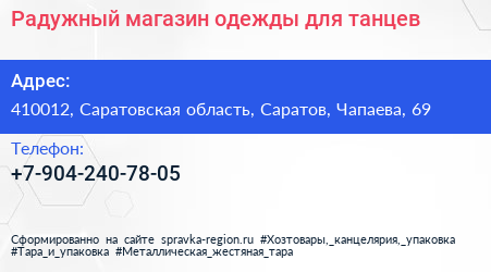 Радужный, магазин одежды для танцев по адресу 410012, Саратовская область, Саратов, Чапаева, 69 в дальнейшем Организация, размещена в следующих категориях: