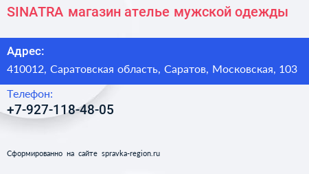 SINATRA, магазин-ателье мужской одежды по адресу 410012, Саратовская область, Саратов, Московская, 103 в дальнейшем Организация, размещена в следующих категориях: